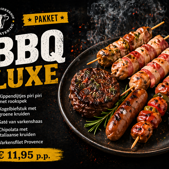 Kipspies omwikkeld met rookspek Kogelbiefstuk met groene kruiden Sate van varkenshaas chipolata Italiaanse kruiden Varkensfilet Provence